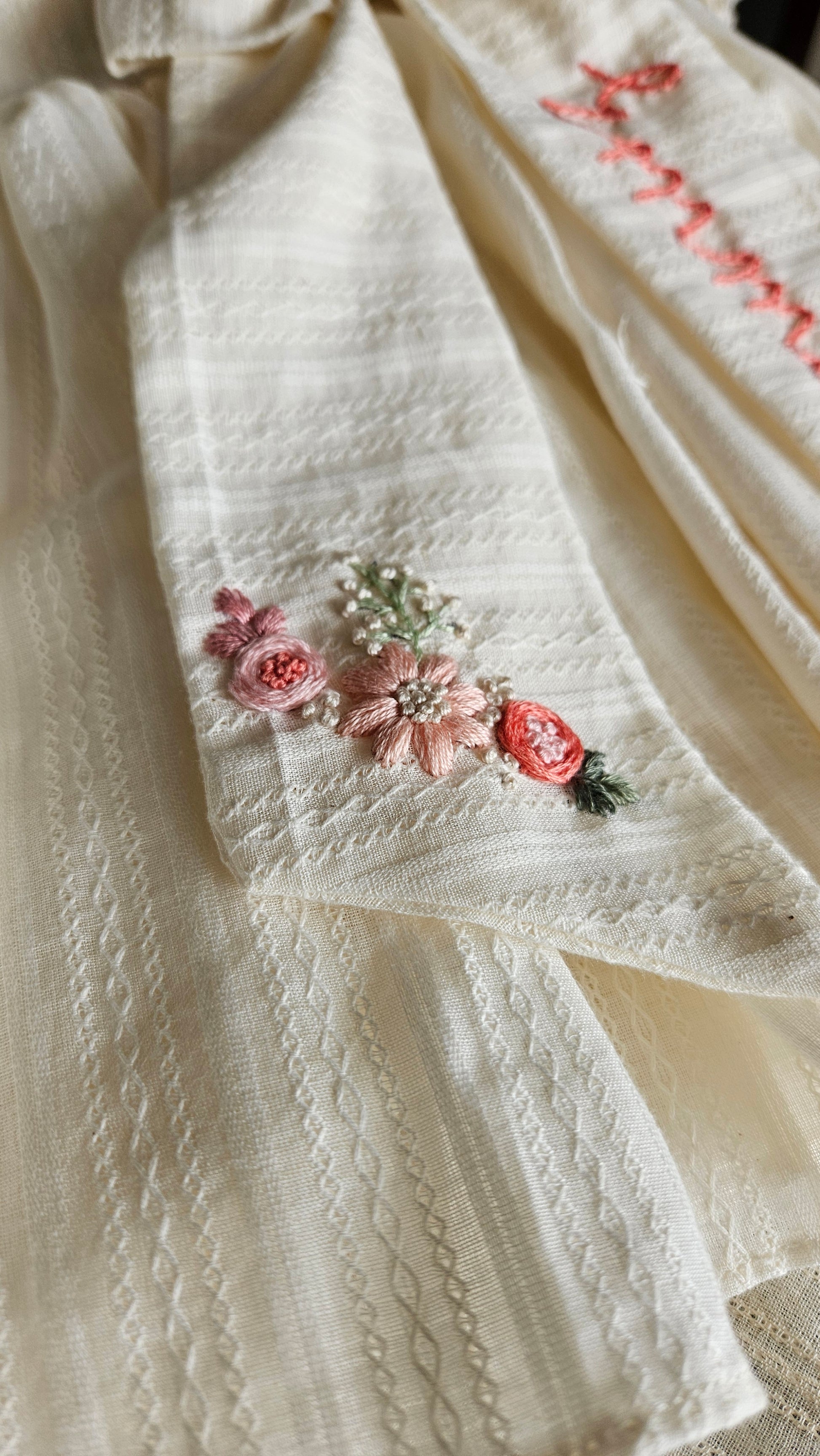 Introduce your little one to the soft charm of our Gardenia Dress, a delicate ivory outfit adorned with hand-embroidered floral motifs in pastel pinks, peaches and greens. Crafted in a textured, breathable fabric, this dress brings together elegance, comfort and timeless craftsmanship.
