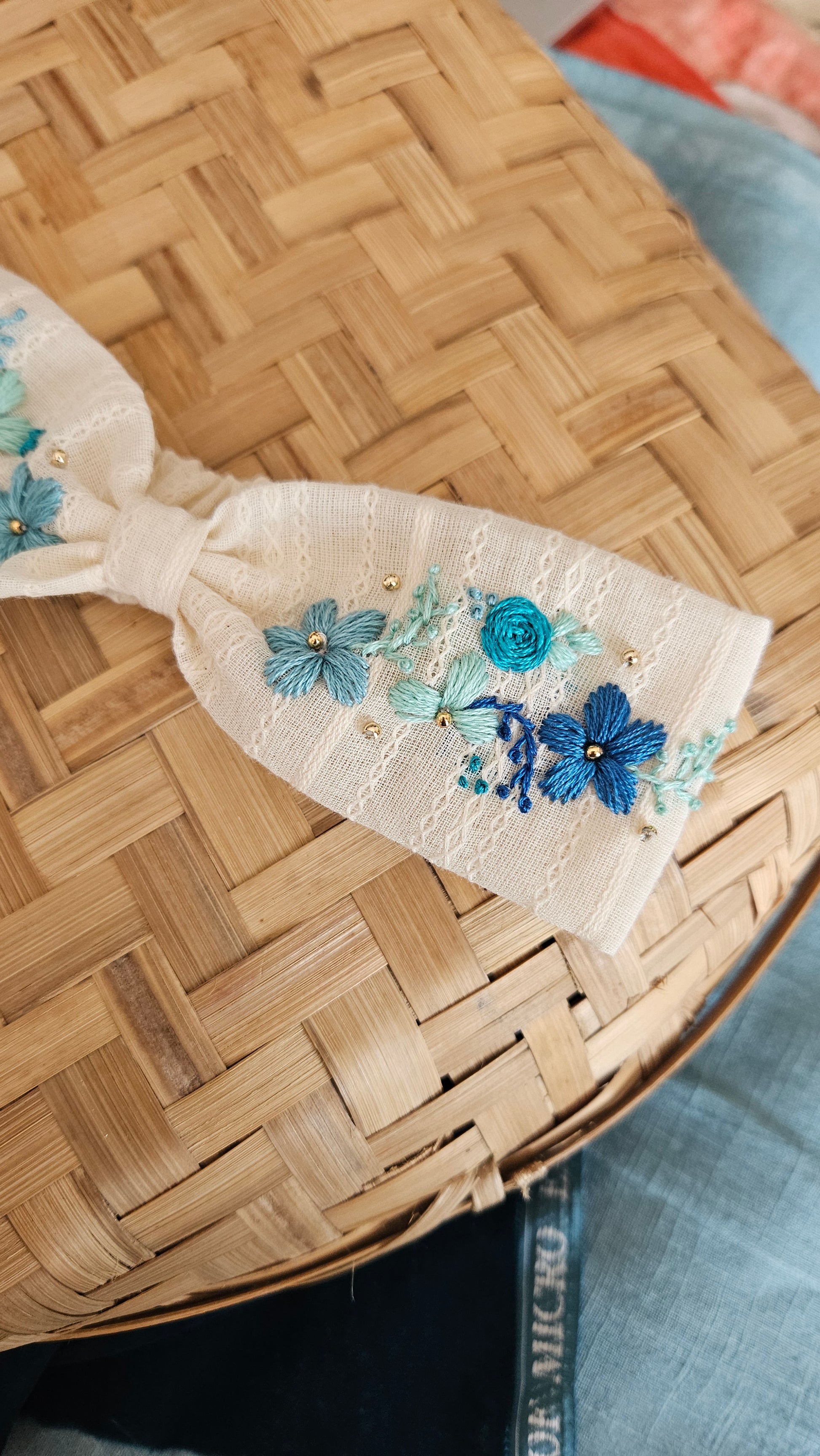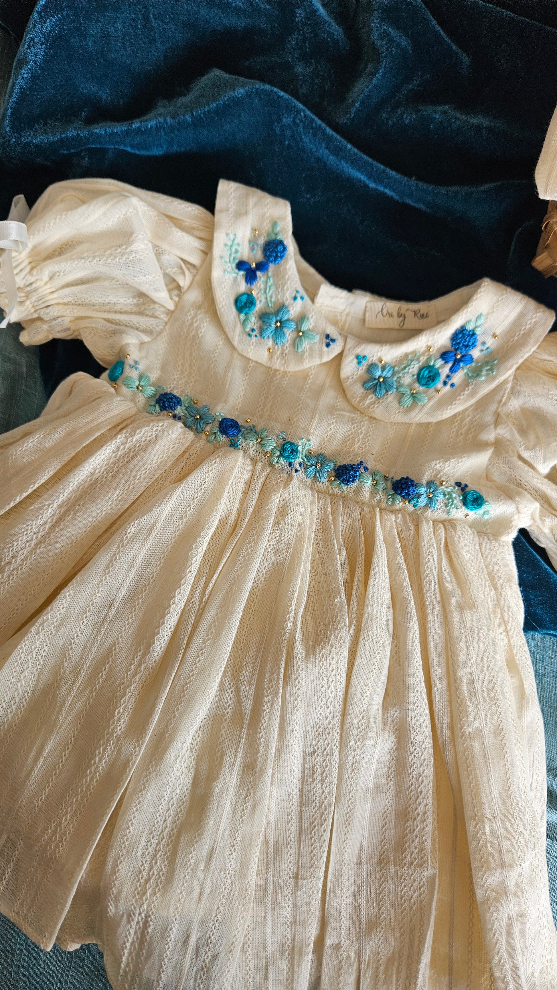 Inspired by the calm beauty of ocean blues, the Oceano Angel Dress is a handcrafted treasure designed for your little one’s most magical moments. Made in soft ivory fabric with a delicate woven texture, this dress features intricate hand embroidery in shades of aqua, teal, and deep ocean blue, each flower lovingly stitched by our artisans at Rui.