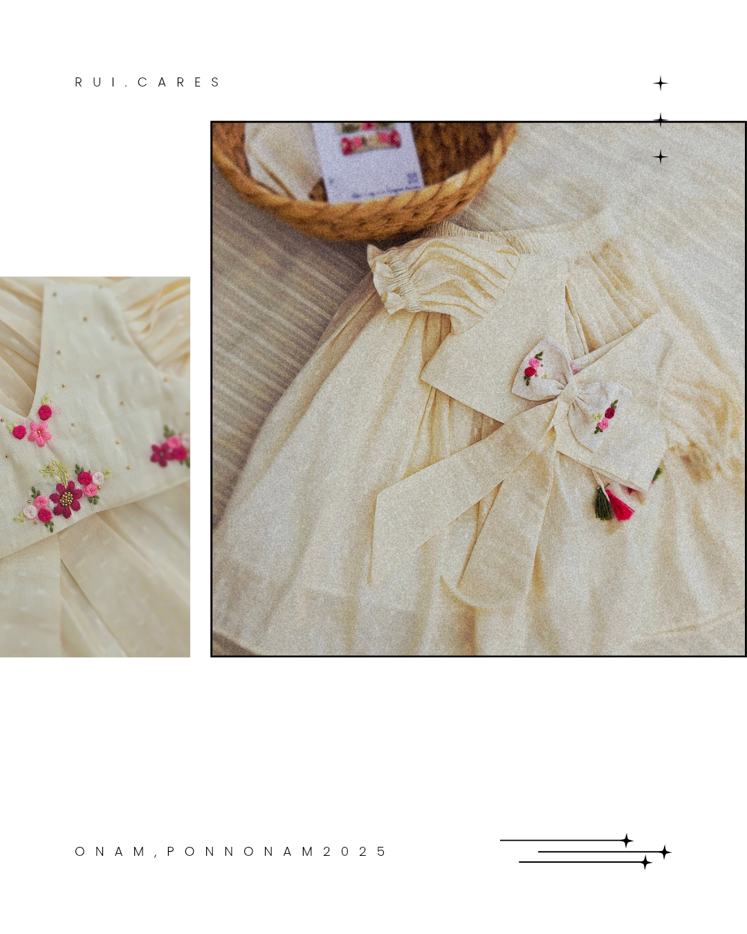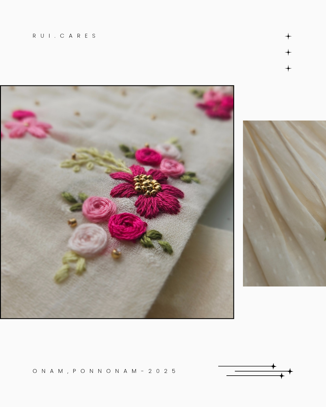 Bring home Pookalam, a beautifully handcrafted festive skirt set from Rui.cares. Inspired by the vibrant floral carpets of Onam, this outfit features intricate hand embroidery in bright pink and magenta florals, paired with a soft cream-gold dobby cotton base that celebrates tradition with a modern touch.