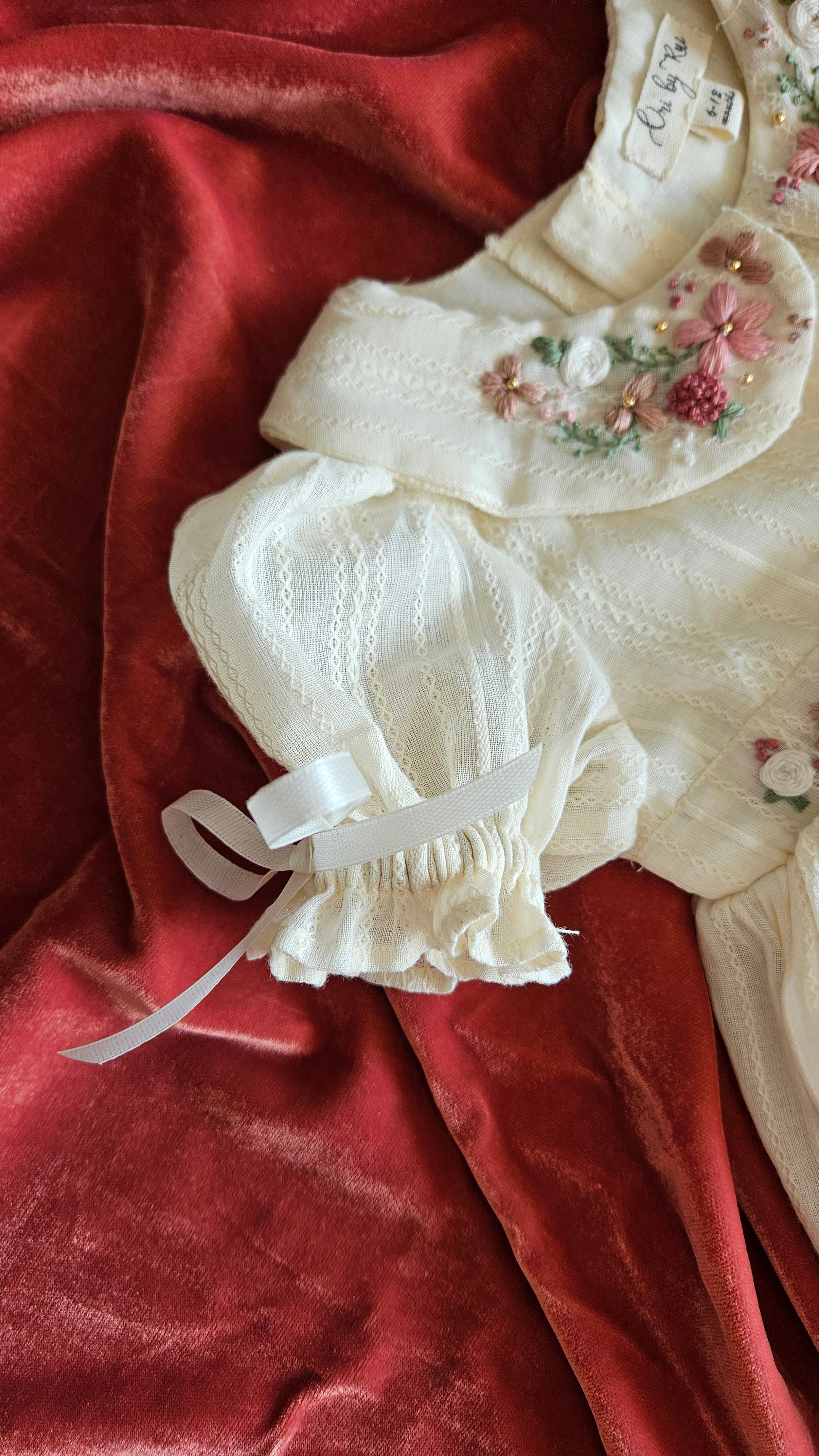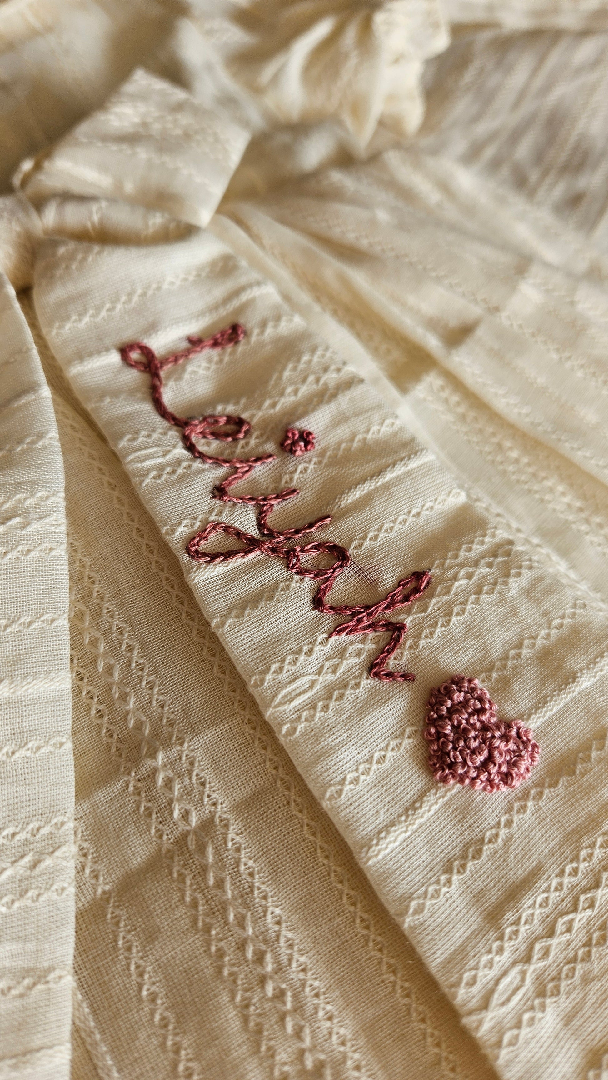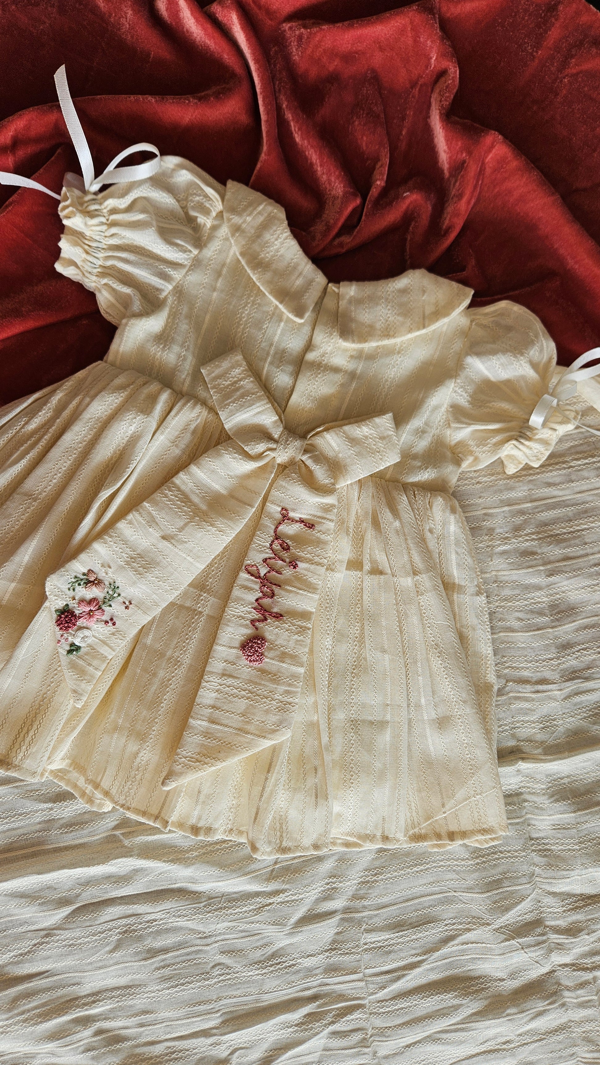 The puffed sleeves tied with ribbon bows, the full gathered skirt, and the intricate floral detailing come together to create a truly timeless silhouette. The highlight of the piece is the customisable back bow, where your baby’s name can be embroidered by handturning the dress into a keepsake filled with love.