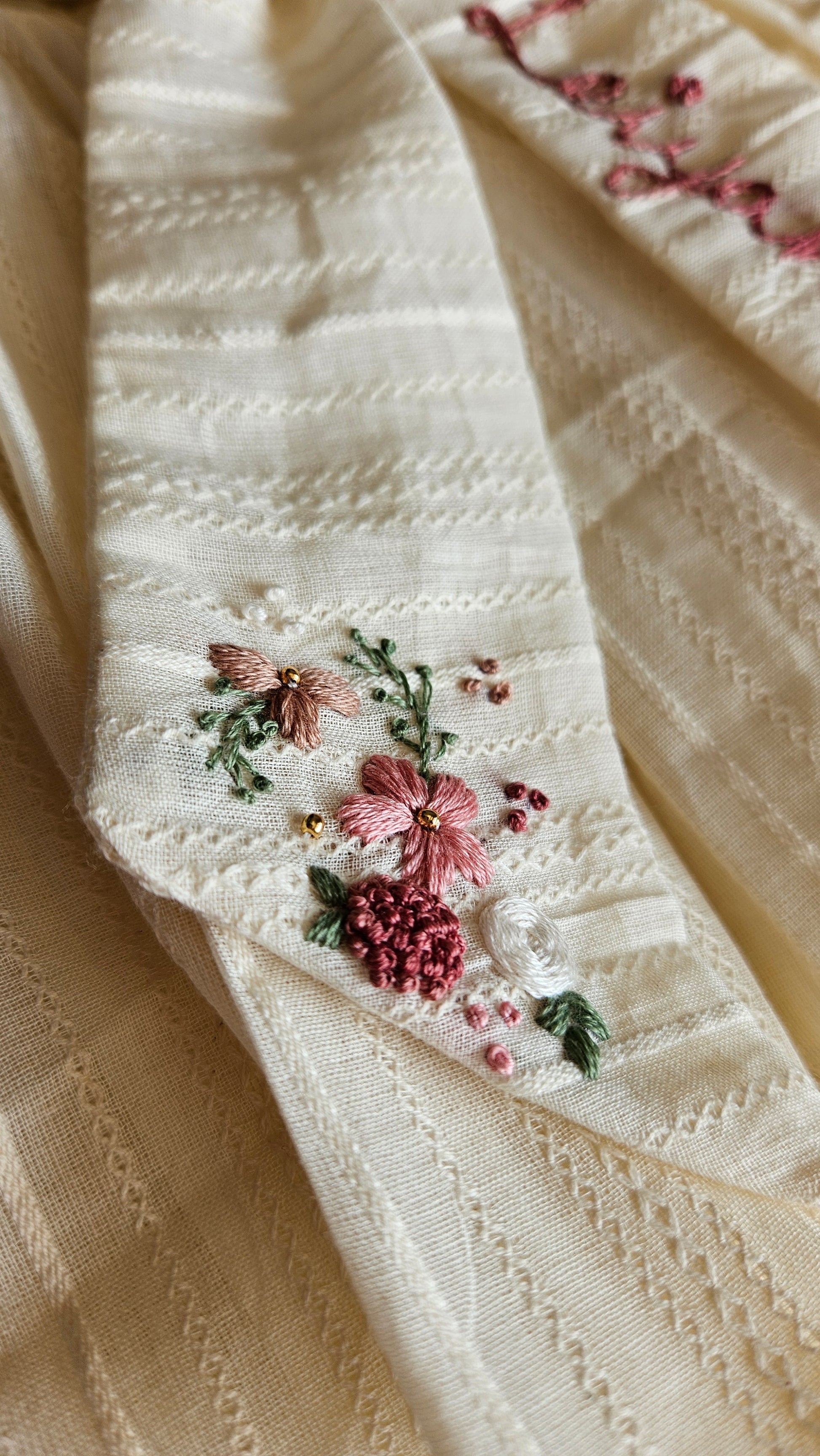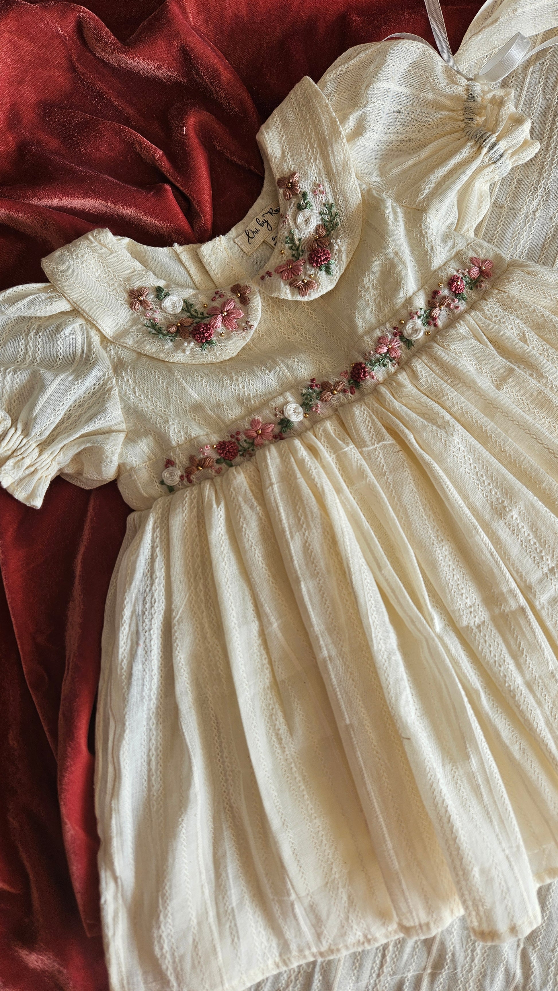 Let your little one shine in our Angel in Heaven Dress, a dreamy ivory outfit adorned with delicate hand-embroidered florals across the collar and bodice. Crafted in a soft textured fabric with lace-like weaving, this dress has an airy, angelic charm that makes it perfect for birthdays, celebrations, christenings, and magical photoshoots.
