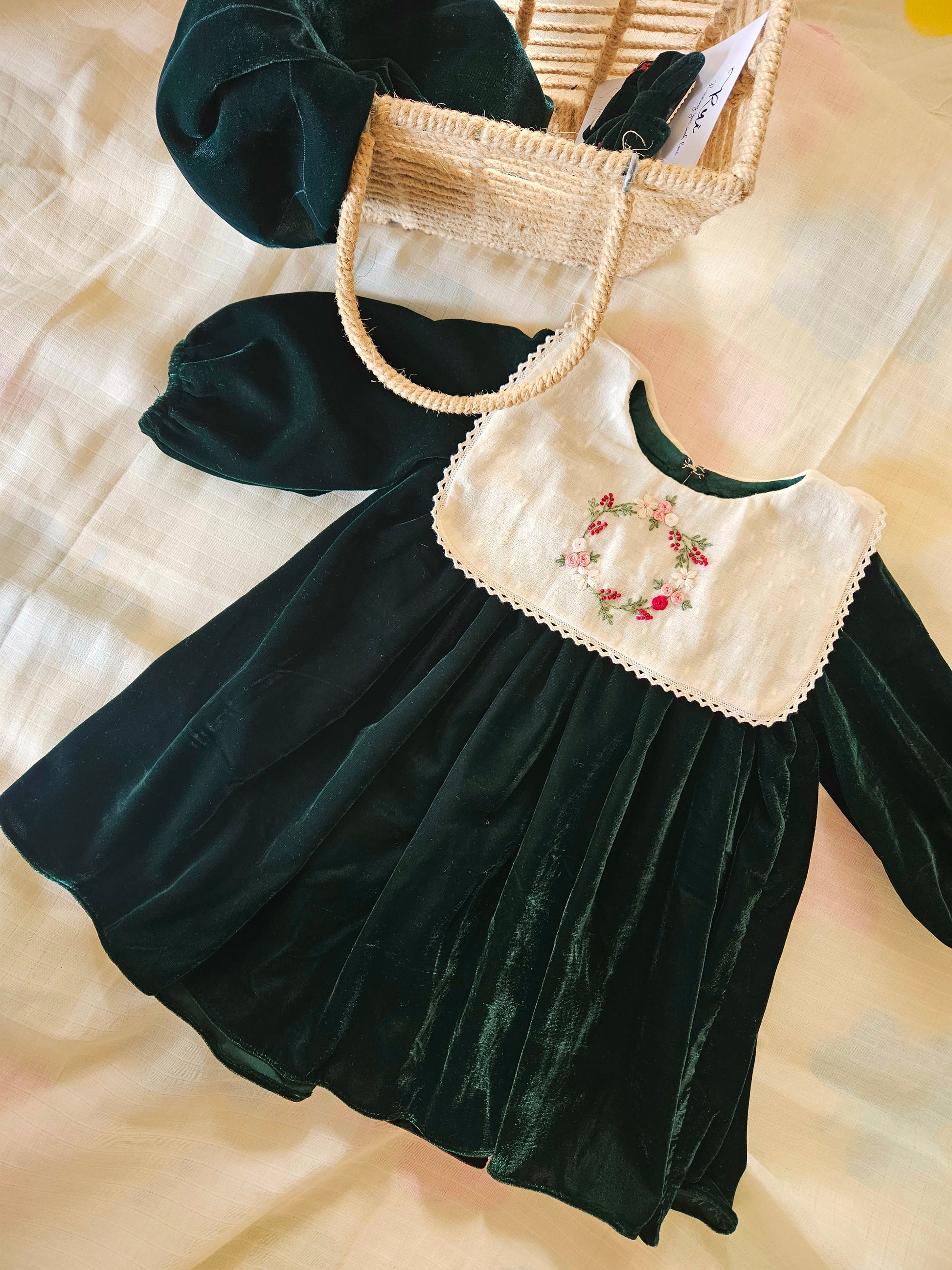 Wrap your little one in festive charm with Velvet Magic, a luxurious Christmas dress crafted in deep emerald velvet. Soft, elegant, and beautifully detailed, this dress features a hand-embroidered floral wreath on an ivory yoke, adding the perfect touch of holiday magic.